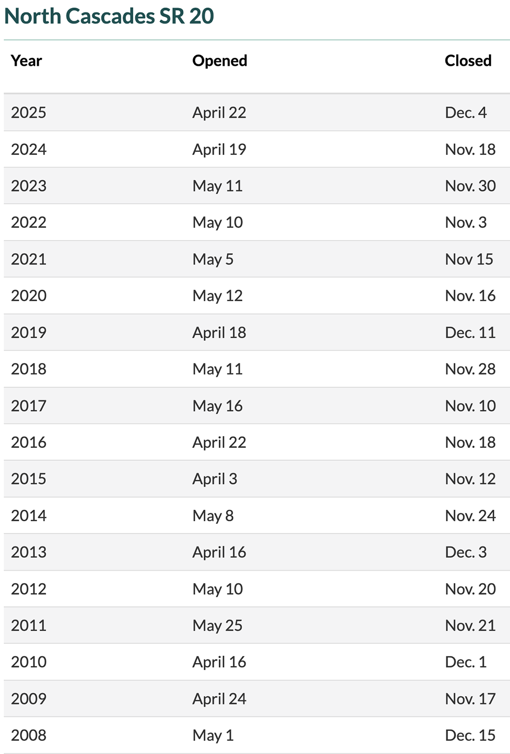 During winter, Highway 20 through North Cascades National Park closes, making this section of the Cascade Loop Scenic Drive impassable.