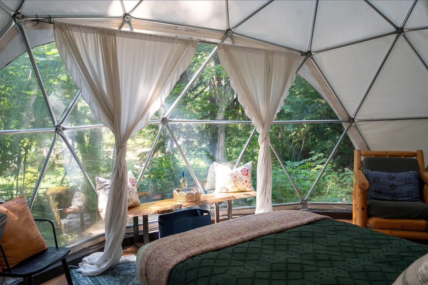 This is glamping at its finest. Stay in a domed tent, surrounded by the forest. Just outside the tent is a toilet, outdoor kitchen, and hot tub.